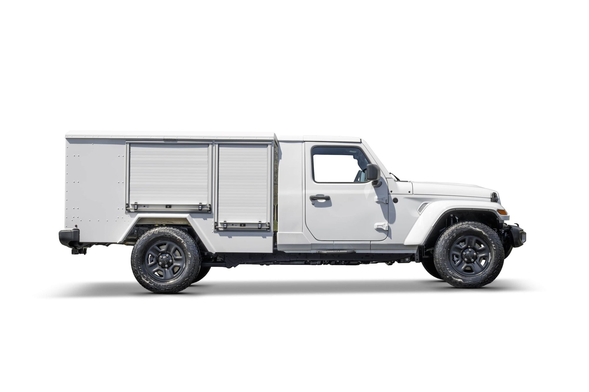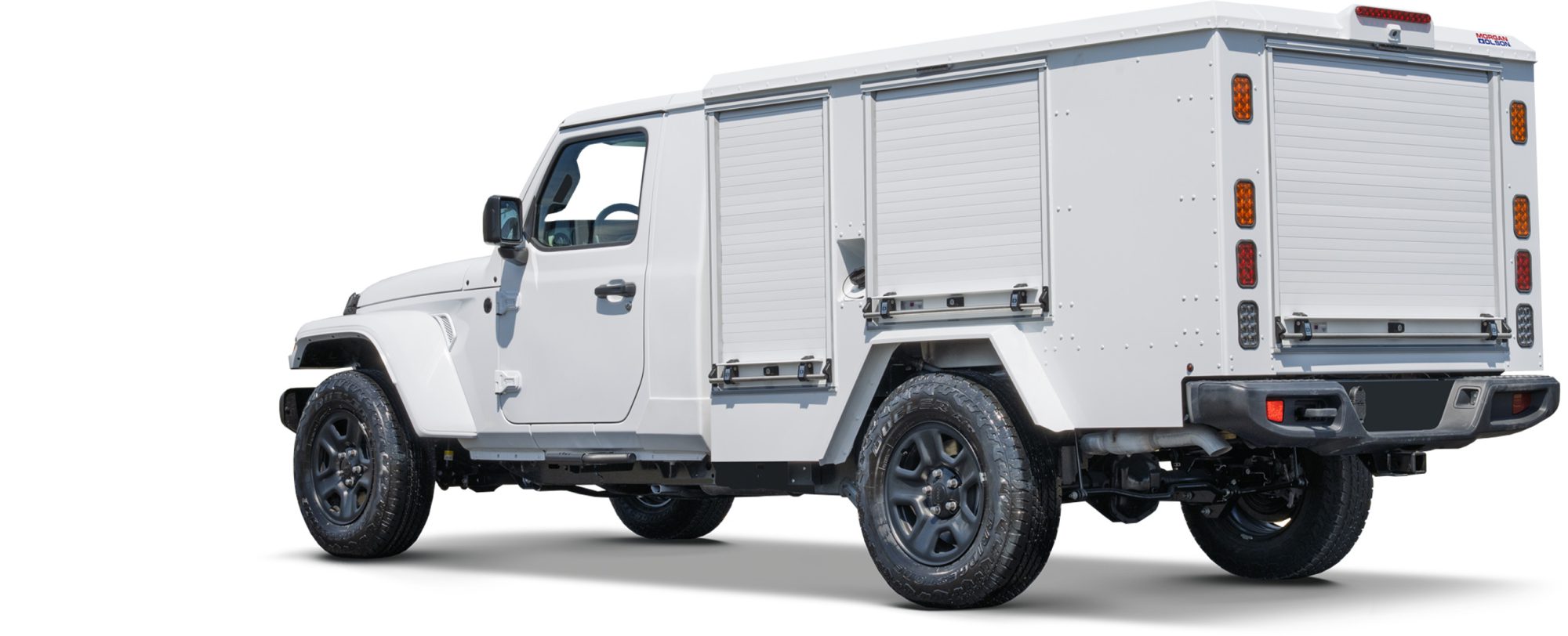 Built by Morgan Olson on the Jeep Gladiator chassis, featuring four-wheel drive for reliable performance on rural terrain, muddy roads, and in winter conditions.